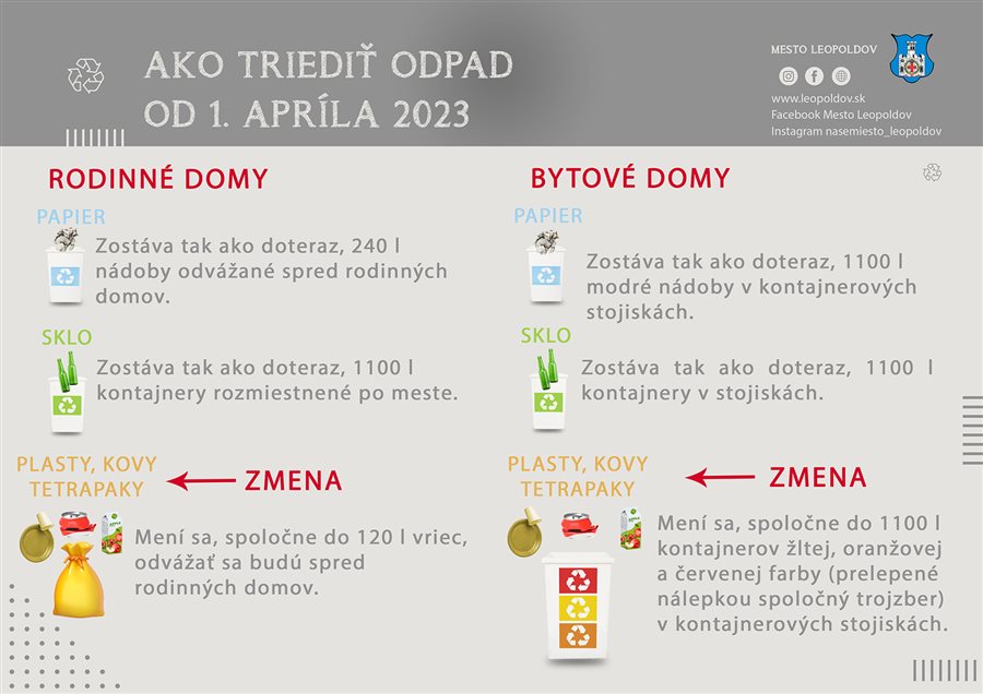 Od 1. 4. 2023 sa kovy, plasty a viacvrtvové kompozitné materiály VKM (tzv. tetrapaky) zbierajú spoločne, v rodinných domoch do vriec, ktoré sa odvážajú spred domov a v bytových domoch do žltých, oranžových a červených nádob v kontajnerových stojiskách.